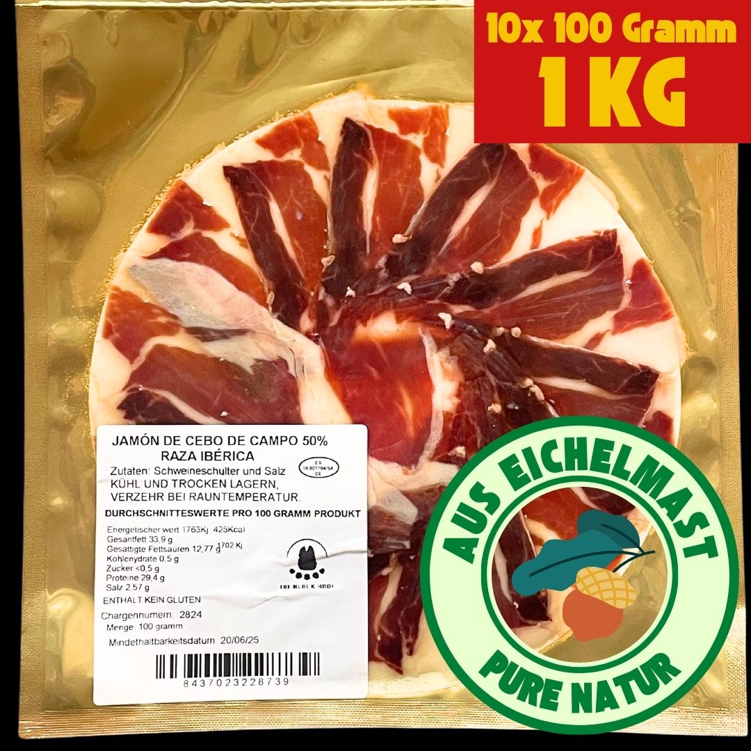 🟢 1 Kg - Grünes Etikett - Handgeschnitzter Iberico Schinken 'Bellota Pata Negra', 18+ Monate gereift - 100% natürlich